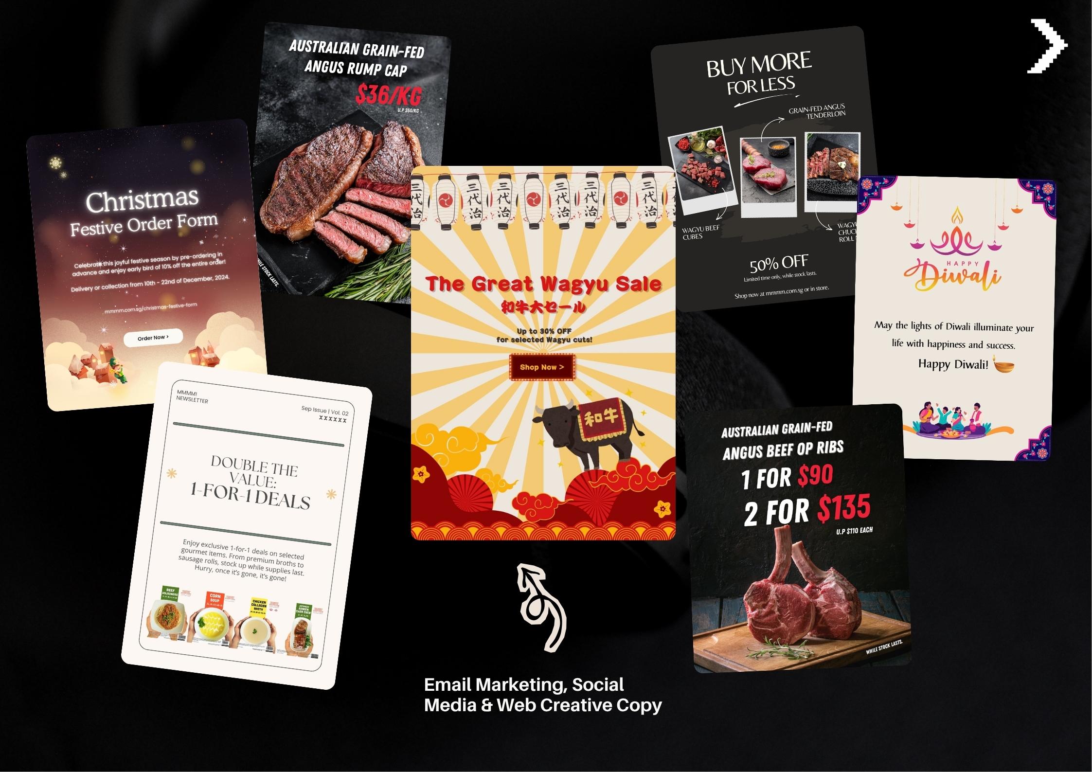 Product photography was produced in-house — wagyu ribeyes, shabu slices, pork belly, and more — providing a consistent library of quality assets for both the website and social channels. Beyond digital content, product labels and packaging were also designed for Mmmm!'s range of house soups and broths, complete with ingredients, allergen information, storage details, and barcode — printed and applied consistently across every pack. Instagram and Facebook were managed consistently, with campaign content, promotional graphics, and seasonal posts produced and scheduled throughout the engagement. Festive campaigns for Chinese New Year, National Day, and Christmas were planned and executed as full content packages.